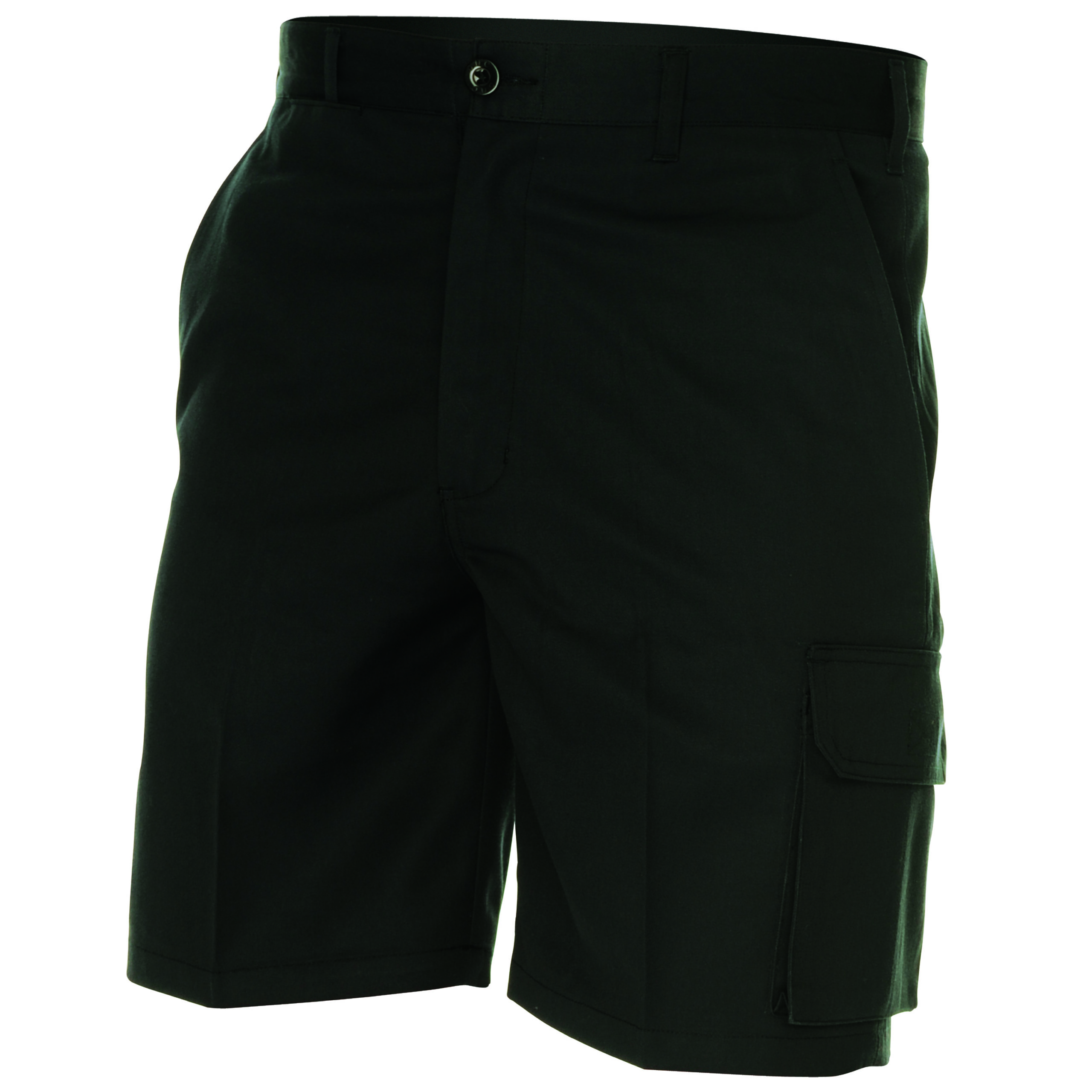 Fabric treated with stain release, plain front. Two side pockets, one rear button down pocket. one side contains large flap cargo pocket, the other a mobile phone pocket.